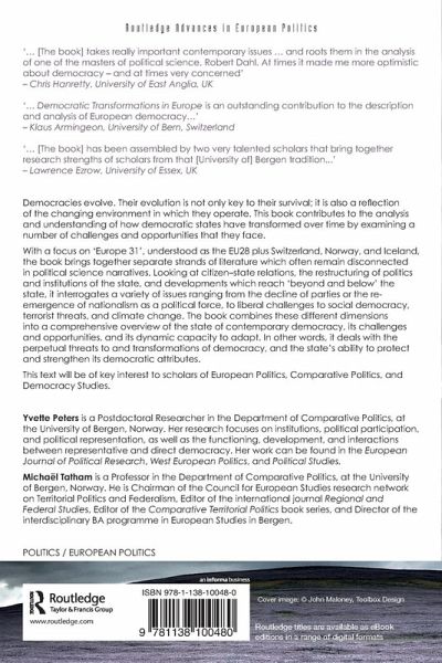Democracies evolve. Their evolution is not only key to their survival; it is also a reflection of the changing environment in which they operate. This book contributes to the analysis and understanding of how democratic states have transformed over time by examining a number of challenges and opportunities that they face. With a focus on 'Europe 31', understood as the EU28 plus Switzerland, Norway, and Iceland, the book brings together separate strands of literature which often remain disconnected in political science narratives. Looking at citizen-state relations, the restructuring of politics and institutions of the state, and developments which reach 'beyond and below' the state, it interrogates a variety of issues ranging from the decline of parties or the re-emergence of nationalism as a political force, to liberal challenges to social democracy, terrorist threats, and climate change. The book combines these different dimensions into a comprehensive overview of the state of contemporary democracy, its challenges and opportunities, and its dynamic capacity to adapt. In other words, it deals with the perpetual threats to and transformations of democracy, and the state's ability to protect and strengthen its democratic attributes. This text will be of key interest to scholars of European Politics, Comparative Politics, and Democracy Studies.