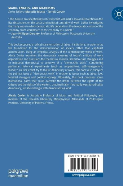 This book proposes a radical transformation of labour institutions, in order to lay the foundation for the democratization of society rather than capitalist accumulation. Using an empirical analysis of the contemporary world of work, Alexis Cukier examines the democratic meaning of today's critique of work organization and questions the theoretical models (linked to class struggles and to industrial democracy) to conceive of a "democratic work." Considering particular historical experiments (such as cooperatives, self-management, worker's councils) that try to realize democracy at work, this book also analyzes the political issue of "democratic work" in relation to issues such as labour law, feminist struggles and political ecology. Ultimately, this book proposes some institutional paths that could overtake the divide between the rights of the citizens and the rights of the workers, arguing finally: if we really want to radicalize democracy, we should begin withdemocratizing work.