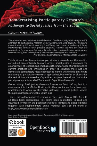 In this book Carmen Martinez-Vargas explores how academic participatory research and the way it is carried out can contribute to more, or less, social justice. Adopting theoretical and empirical approaches, and addressing multiple complex, intersectional issues, this book offers inspiration for scholars and practitioners to open up alternative pathways to social justice, viewed through a Global South lens. Martinez-Vargas examines the colonial roots of research and emphasises the importance of problematising current practices and limitations in order to establish more just and democratic participatory research practices. Although practitioners have been challenging the Western roots of research and participatory research for decades, their goals can be compromised by pluralities and contradictions in the field. This book aims not to replicate past participatory research approaches, but to offer an innovative theoretical foundation-the Capabilities Approach-and an innovative participatory practice called 'Democratic Capabilities Research'. Democratising Participatory Research is not only timely and relevant in South Africa, but also in the Global North owing to the current crisis of values jeopardising the peaceful existence of diverse societies. The book gives essential recommendations for capabilities and human development scholars to reframe their perspectives and uses of the Capabilities Approach, as well as for participatory practitioners to critically reflect on their practices and their often limited conceptualisation of participation.