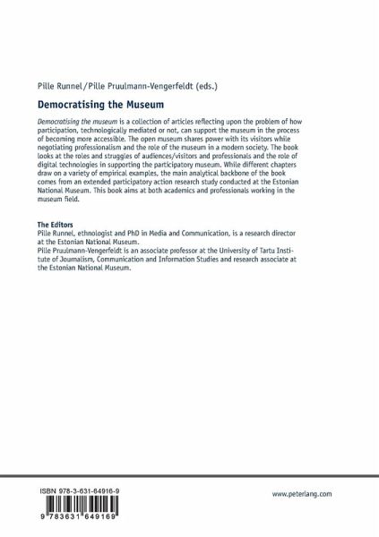 Democratising the museum is a collection of articles reflecting upon the problem of how participation, technologically mediated or not, can support the museum in the process of becoming more accessible. The open museum shares power with its visitors while negotiating professionalism and the role of the museum in a modern society. The book looks at the roles and struggles of audiences/visitors and professionals and the role of digital technologies in supporting the participatory museum. While different chapters draw on a variety of empirical examples, the main analytical backbone of the book comes from an extended participatory action research study conducted at the Estonian National Museum. This book aims at both academics and professionals working in the museum field.