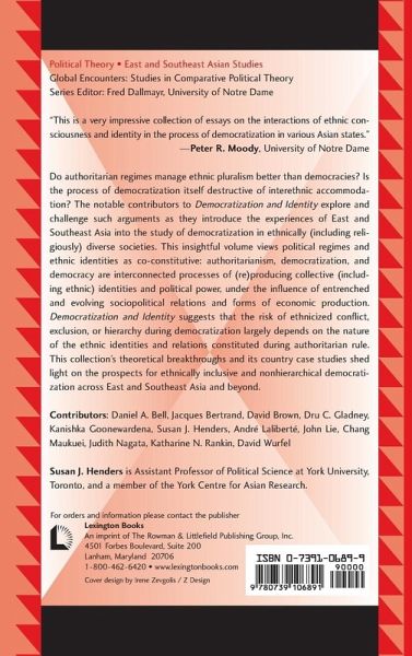 The notable contributors to Democratization and Identity introduce the experiences of East and Southeast Asia into the study of democratization in ethnically (including religiously) diverse societies. This collection suggests that the risk of ethnicized conflict, exclusion, or hierarchy during democratization depends in large part on the nature of the ethnic identities and relations constituted during authoritarian rule. This volume's theoretical breakthroughs and its country case studies shed light on the prospects for ethnically inclusive and non-hierarchical democratization across East and Southeast Asia and beyond.