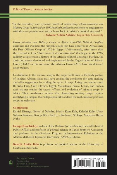 Democratization and Military Coups in Africa: Post-1990 Political Conflicts studies the seemingly endless cycle of coups that have occurred in Africa since the "Free Officers Coup" of 1952 in Egypt. Unfortunately, after more than three decades of the "third wave of democratization" that began in the 1990’s, military coups remain a firm figure on the African political landscape. Although the Organization of African Unity (OAU) and its successor, the African Union (AU), have developed and implemented anti-coup norms, they have not deterred coup-makers. Contributors to this volume analyze the major fault lines in the body politics of African states that have created the conditions for coup-making and offer suggestions for ending the cycle of coups. Using countries such as Burkina Faso, Cote d'Ivoire, Egypt, Mauritania, Sierra Leone, and Sudan as case studies, each chapter studies the causes, effects, and evolution of military coups in Africa in order to show that eliminating military coups will require identifying and addressing the root causes of the coup in each affected state.