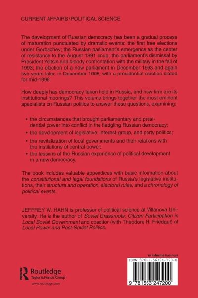 The development of Russian democracy has been a gradual process of maturation punctuated by dramatic events. This text examines events such as the first free elections, the Russian parliament's resistance to the 1991 coup, and the bloody confrontation with the military in 1993.