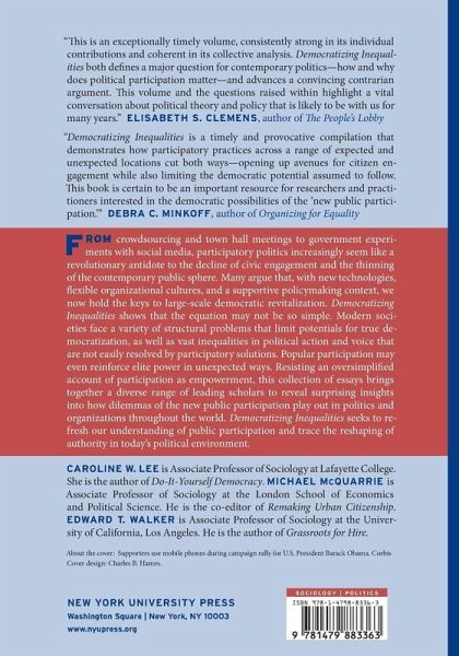 Opportunities to "have your say," "get involved," and "join the conversation" are everywhere in public life. From crowdsourcing and town hall meetings to government experiments with social media, participatory politics increasingly seem like a revolutionary antidote to the decline of civic engagement and the thinning of the contemporary public sphere. Many argue that, with new technologies, flexible organizational cultures, and a supportive policymaking context, we now hold the keys to large-scale democratic revitalization. Democratizing Inequalities shows that the equation may not be so simple. Modern societies face a variety of structural problems that limit potentials for true democratization, as well as vast inequalities in political action and voice that are not easily resolved by participatory solutions. Popular participation may even reinforce elite power in unexpected ways. Resisting an oversimplified account of participation as empowerment, this collection of essays brings together a diverse range of leading scholars to reveal surprising insights into how dilemmas of the new public participation play out in politics and organizations. Through investigations including fights over the authenticity of business-sponsored public participation, the surge of the Tea Party, the role of corporations in electoral campaigns, and participatory budgeting practices in Brazil, Democratizing Inequalities seeks to refresh our understanding of public participation and trace the reshaping of authority in today's political environment.