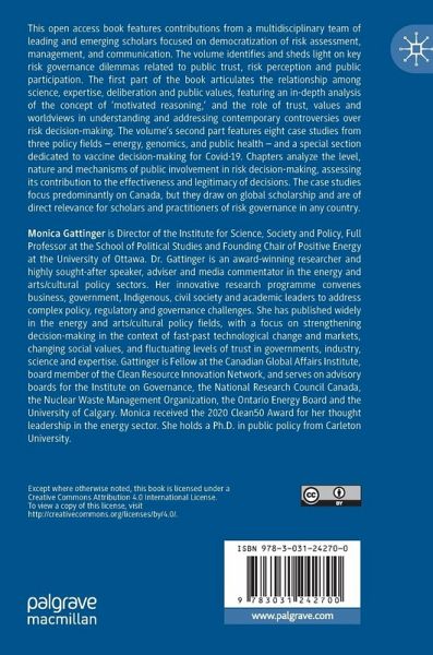 Chapter 1:Introduction - Risk governance dilemmas and democratization: public trust, risk perception and public participation in risk decision-making.- Part I: Motivated reasoning, science and values: rethinking risk perception and public participation in risk governance.- Chapter 2: Motivated reasoning and risk governance: what risk scholars and practitioners need to know.- Chapter 3: Science and values: the pervasive entanglement.- Chapter 4: The BIAS FREE Framework: A tool for science/technology and society education to increase science and risk literacy.- Part II: Public trust, risk perception and public participation: lessons from the real worlds of risk governance Energy.- Chapter 5: Getting it Right? The Site Selection Process for Canada's High-Level Nuclear Waste.- Chapter 6: Hydraulic fracturing in New Brunswick: trust, deliberation and risk decision-making. Chapter 7: Carbon capture, utilization and storage: public confidence in risk decision-making.- Chapter 8: Public Inclusion and Responsiveness in Governance of Genetically Engineered Animals.- Chapter 9: Decision-making about Newborn screening panels in Canada: risk management and public participation.- Chapter 10: Balancing shared decision-making with population-based recommendations: a policy perspective of PSA testing and mammography screening.- Chapter 11: Public Engagement on Childhood Vaccination: Democratizing policy decision-making through public deliberation.- Chapter 12: Narratives and the Water Fluoridation Controversy.- Chapter 13: Exploring the Role of Information Sources in Vaccine Decision-Making among Four Culturally and Linguistically Diverse Communities in the U.S.- Chapter 14: Opportunities and Perils of Public Consultation in the creation of COVID-19 vaccine priority groups.