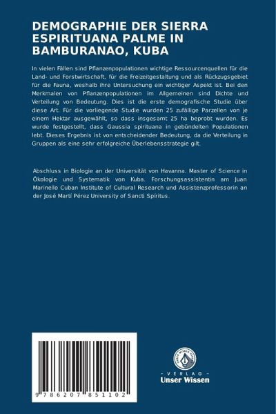 In vielen Fällen sind Pflanzenpopulationen wichtige Ressourcenquellen für die Land- und Forstwirtschaft, für die Freizeitgestaltung und als Rückzugsgebiet für die Fauna, weshalb ihre Untersuchung ein wichtiger Aspekt ist. Bei den Merkmalen von Pflanzenpopulationen im Allgemeinen sind Dichte und Verteilung von Bedeutung. Dies ist die erste demografische Studie über diese Art. Für die vorliegende Studie wurden 25 zufällige Parzellen von je einem Hektar ausgewählt, so dass insgesamt 25 ha beprobt wurden. Es wurde festgestellt, dass Gaussia spirituana in gebündelten Populationen lebt. Dieses Ergebnis ist von entscheidender Bedeutung, da die Verteilung in Gruppen als eine sehr erfolgreiche Überlebensstrategie gilt.
