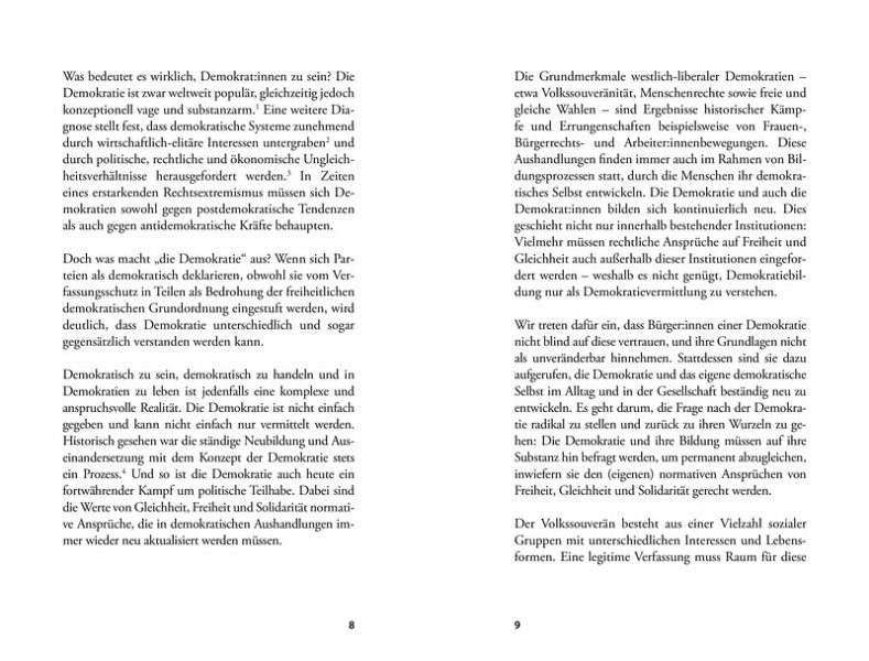 Der Essay zeigt auf, dass Demokratie sowohl historisch als auch heute ein umkämpftes Gut darstellt, das nicht nur eine Herrschaftsform, sondern zugleich eine Gesellschafts- und eine Lebensform umfasst. Im Sportverein gegen Rassismus und Sexismus aufzustehen, bereits Kindern Mitbestimmung zu ermöglichen, einen Betriebsrat zu gründen oder die Verwandten zum Wählen motivieren, all das verlangt demokratische Haltung. Voraussetzung dafür ist jedoch eine Bildung und Selbstbildung, in der sichBürger:innen ihres eigenen, demokratischen Selbst bewusst werden. Denn erst dieses Bewusstsein ermöglicht es den Ansprüchen von Freiheit, Gleichheit und Solidarität gerecht zu werden und die Substanz der Demokratie von ihren Wurzeln aus zu erneuern.