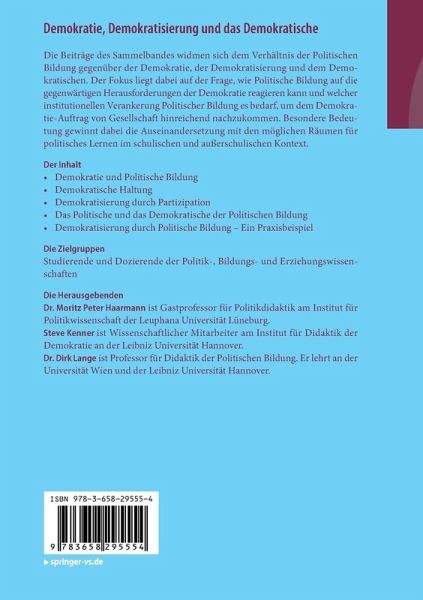 Die Beiträge des Sammelbandes widmen sich dem Verhältnis der Politischen Bildung gegenüber der Demokratie, der Demokratisierung und dem Demokratischen. Der Fokus liegt dabei auf der Frage, wie Politische Bildung auf die gegenwärtigen Herausforderungen der Demokratie reagieren kann und welcher institutionellen Verankerung Politischer Bildung es bedarf, um dem Demokratie-Auftrag von Gesellschaft hinreichend nachzukommen. Besondere Bedeutung gewinnt dabei die Auseinandersetzung mit den möglichen Räumen für politisches Lernen im schulischen und außerschulischen Kontext.