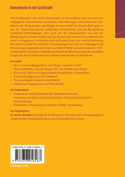 Wie funktioniert die lokale Demokratie in Deutschland und was sind die wichtigsten Determinanten politischer Orientierungen und politischen Verhaltens der Bürgerinnen und Bürger in einer Stadt? In diesem Buch geht es um die Wahrnehmung der politischen Wirklichkeit und die Beschaffung politischer Informationen, aber auch um die Verbundenheit mit und der Bewertung der lokalen Politik und die Bereitschaft sich vor Ort politisch und sozial zu engagieren. Außerdem geht die Studie darauf ein, welche Bedeutung das lokale Umfeld für politische Orientierungen hat und wie Haltungen und Erwartungen gegenüber der Stadt und ihrer Politik zustande kommen. Stellvertretend für deutsche Großstädte geschieht die Beantwortung der gestellten Fragen für das Funktionieren der lokalen Demokratie in Mannheim.