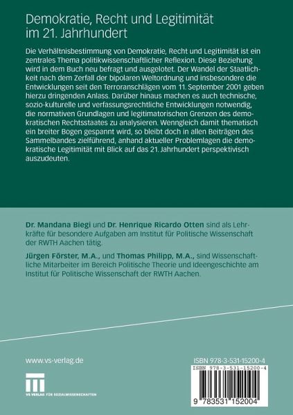 Grenzverhältnisse von Demokratie und Recht.- Legitimität und politische Partizipation. Zur Frage der Vereinbarkeit von Volkssouveränität und Kapitalismus im 21. Jahrhundert.- Doppeltes Recht oder Das Recht zur Ausnahme. Die Aktualität Carl Schmitts im war on terror.- Der liberale Rechts- und Verfassungsstaat: Zur Genese und Bedeutung der Trennung von Recht und Religion.- Unsere Demokratie -unser Territorium Zur Legitimität exklusiver Raumansprüche.- Recht, Ausnahme, Existenz.- Leben im Ausnahmezustand - Über den Widerspruch zwischen Freiheit und Sicherheit.- Ja zur Folter - Ja zum Rechtsstaat? Wider die Relegitimierung der Folter in Deutschland.- Die Garantie der Menschenrechte als politisches Argument. Eine Skizze des Arendtschen Rechtsverständnisses.- Grenzen der Demokratie. Die Herausforderung durch die gentechnische Revolution.- Konstruktionen demokratischer Legitimität.- Braucht Europa eine Verfassung? Einige Anmerkungen zur Grimm-Habermas-Debatte.- Legitimation jenseits von Staatlichkeit. Nichtregierungsorganisationen als Akteure der internationalen Politik.- Rechtsverhinderung oder Systembestätigung? Zur Funktion nicht-parlamentarischer Untersuchungskommissionen in den USA: Die Tower Commission und die Schlesinger Commission.- Demokratie in den Nord-Süd Beziehungen - Politische Konsequenzen theoretischer Entscheidungen.- Afrikanische Demokratiemodelle als Wegweiser?.- Völkerrecht und Legitimität des Krieges im Wandel.- "... a general loosing of the ties of civilized society..." - Democratic Interventionism als legales oder legitimes außenpolitisches Instrument im 21. Jahrhundert?.- Krieg trotz Risikoaversion - Die fragwürdige These von der post-heroischen Verfasstheit entwickelter Gesellschaften und die soziale Dimensionstrategischen Handelns.