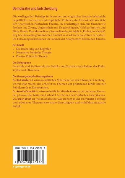 Die vorliegenden Beiträge in deutscher und englischer Sprache behandeln begriffliche, normative und empirische Probleme der Demokratie aus Sicht der Analytischen Politischen Theorie. Sie beschäftigen sich mit Themen wie Freiheit und Zwang, Ungleichheit und Ungerechtigkeit, Wahlversprechen und Dirty Hands. Das Motto dieses Sammelbandes ist folglich 'Einheit in Vielfalt': Er gibt einen außergewöhnlichen Einblick in den Facettenreichtum der aktuellen Forschungsdiskussionen im Rahmen der Analytischen Politischen Theorie.