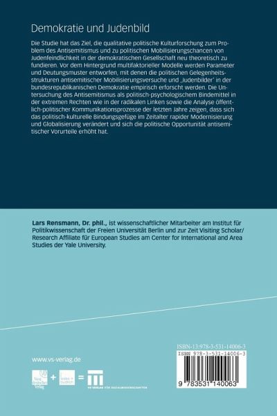 Die Studie hat das Ziel, die qualitative politische Kulturforschung zum Problem des Antisemitismus und zu politischen Mobilisierungschancen von Judenfeindlichkeit in der demokratischen Gesellschaft neu zu fundieren. Vor dem Hintergrund multifaktorieller Modelle werden Parameter und Deutungsmuster entworfen, mit denen die politischen und diskursiven Gelegenheitsstrukturen antisemitischer Mobilisierungsversuche und 'Judenbilder' in der bundesrepublikanischen Demokratie empirisch erforscht werden. Die Untersuchung des Antisemitismus als ideologischem und politisch-psychologischem Bindemittel in der extremen Rechten wie in der radikalen Linken sowie die Analyse öffentlich-politischer Diskursprozesse der letzten Jahre zeigen, dass sich das politisch-kulturelle Bedingungsgefüge im Zeitalter rapider Modernisierung und Globalisierung verändert und sich die politische Opportunität antisemitischer Vorurteile erhöht hat.