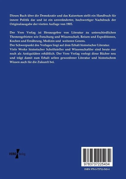 Dieses Buch über die Demokratie und das Kaisertum stellt ein Handbuch für innere Politik dar und ist ein unveränderter, hochwertiger Nachdruck der Originalausgabe der vierten Auflage von 1905.