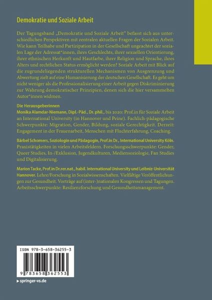 Monika Alamdar-Niemann, Dipl.-Päd., Dr. phil., bis 2020: Prof.in für Soziale Arbeit an International University (in Hannover und Peine). Fachlich-pädagogische Schwerpunkte: Migration, Gender, Bildung, soziale Gerechtigkeit. Derzeit: Engagement in der Frauenarbeit, Menschen mit Fluchterfahrung, Coaching. Bärbel Schomers, Soziologin und Pädagogin, Prof.in Dr., International University Köln. Praxistätigkeiten in vielen Arbeitsfeldern. Forschungsschwerpunkte: Gender, Queer Studies, In-/Exklusion, Jugendkulturen, Mediensoziologie, Fan Studies und Digitalisierung. Marion Tacke, Prof.in Dr.rer.nat., habil. International University und Leibniz-Universität Hannover. Lehre/Forschung in Sozialwissenschaften. Vielfältige Veröffentlichungen zur Gesundheit. Vorträge auf (inter-)nationalen Kongressen und Tagungen. Arbeitsschwerpunkte: Resilienzforschung und Gesundheitsmanagement.