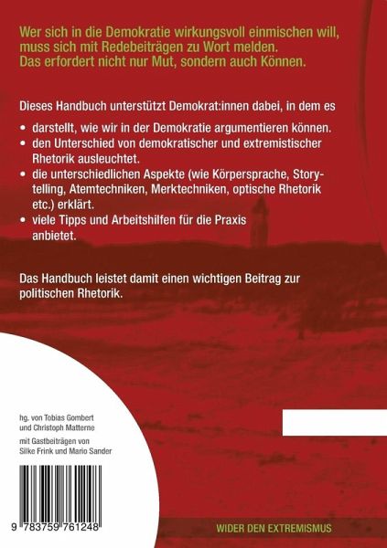 Wer sich in die Demokratie wirkungsvoll einmischen will, muss sich mit Redebeiträgen zu Wort melden. Das erfordert nicht nur Mut, sondern auch Können. Dieses Handbuch unterstützt Demokrat:innen, in dem es - darstellt, wie wir in der Demokratie argumentieren können, - den Unterschied von demokratischer und extremistischer Rhetorik ausleuchtet. - die unterschiedlichen Aspekte (wie Körpersprache, Storytelling, Atemtechniken, Merktechniken, optische Rhetorik) etc. erklärt. - in dem es viele Tipps und Arbeitshilfen für die Praxis anbietet. Das Handbuch bietet damit einen wichtigen Beitrag zur politischen Rhetorik.