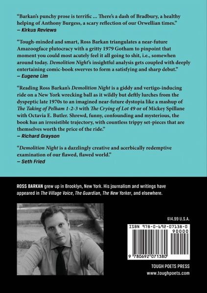 America, the not-too-distant future. Citizens are indefinitely contracted to megacorporations in a system that is slavery in everything but name. Sundra Glassgarden, one of the enslaved, can't take it anymore. To change her fate, she steals a time machine with the goal of killing the mother of Octavio Velez, the charismatic president who created this nightmare. Meanwhile, in 1979, Archie London, a pugilistic cop-turned-private eye, is on his own messianic mission in decrepit New York, single-handedly battling a gang he believes is a threat to life itself. Along the way, Archie stumbles upon the most remarkable woman he has ever met: 21-year-old Lolita Velez. Waiting for Lolita-and love-struck Archie-is Sundra, hell-bent on freeing her future by undoing the past. Demolition Night is a satirical yet haunting novel about love and fate and technology's grim promise, about the sibilating streets of New York and the utopias we can never have-and why we keep struggling anyway.