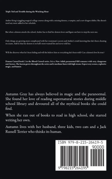 Triple Toil and Trouble during the Witching Hour Amber Krieg is juggling magical college courses along with a missing demon, a vampire, and a new dragon shifter. She doesn't need any more added to her schedule. But when a demon attacks the school, Amber has to find her demon lover and figure out how to stop the next one. Only things are growing more complicated with her roommate's secrets and Amber's crush knowing that she's been cheating on exams. Add in that her demon is on hell's most wanted list and never told her. Will she discover what he's been hiding and will she believe him or everything she's been told? Can a demon's love be true? Demon Cursed book 2 in the Blood Cursed series. It is a New Adult paranormal RH romance with sexy, dangerous anti-heroes. The harem grows throughout the series and is medium-burn with high steam. Expect sexy scenes, explosive magic, and humor. Scroll Up and One-Click Blood Cursed and start your addiction today!
