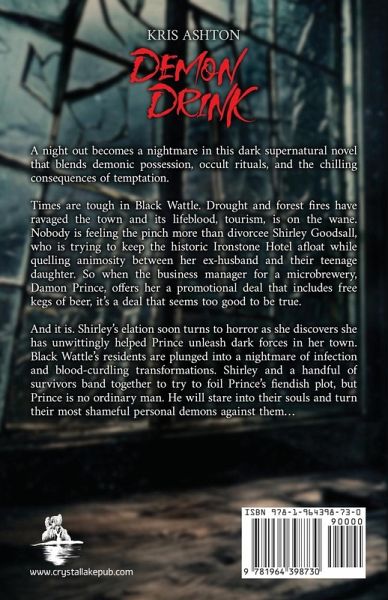A night out becomes a nightmare in this dark supernatural novel that blends demonic possession, occult rituals, and the chilling consequences of temptation. Times are tough in Black Wattle. Drought and forest fires have ravaged the town and its lifeblood, tourism, is on the wane. Nobody is feeling the pinch more than divorcee Shirley Goodsall, who is trying to keep the historic Ironstone Hotel afloat while quelling animosity between her ex-husband and their teenage daughter. So when the business manager for a microbrewery, Damon Prince, offers her a promotional deal that includes free kegs of beer, it's a deal that seems too good to be true. And it is. Shirley's elation soon turns to horror as she discovers she has unwittingly helped Prince unleash dark forces in her town. Black Wattle's residents are plunged into a nightmare of infection and blood-curdling transformations. Shirley and a handful of survivors band together to try to foil Prince's fiendish plot, but Prince is no ordinary man. He will stare into their souls and turn their most shameful personal demons against them... Fans of Stephen King's earlier novels such as 'Salem's Lot and Needful Things will revel in every ghastly, page-turning detail of Demon Drink, a master class in small-town horror from Australian Shadows Award Winner, Kris Ashton. Can you handle your drink? Click the link to find out! Proudly represented by Crystal Lake Publishing-Where Stories Come Alive!