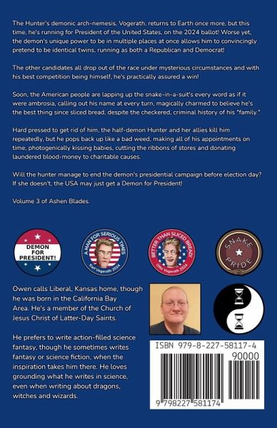The Hunter's demonic arch-nemesis, Vogerath, returns to Earth once more, but this time, he's running for President of the United States, on the 2024 ballot! Worse yet, the demon's unique power to be in multiple places at once allows him to convincingly pretend to be identical twins, running as both a Republican and Democrat! The other candidates all drop out of the race under mysterious circumstances and with his best competition being himself, he's practically assured a win! Soon, the American people are lapping up the snake-in-a-suit's every word as if it were ambrosia, calling out his name at every turn, magically charmed to believe he's the best thing since sliced bread, despite the checkered, criminal history of his "family." Hard pressed to get rid of him, the half-demon Hunter and her allies kill him repeatedly, but he pops back up like a bad weed, making all of his appointments on time, photogenically kissing babies, cutting the ribbons of stores and donating laundered blood-money to charitable causes. Will the hunter manage to end the demon's presidential campaign before election day? If she doesn't, the USA may just get a Demon for President! Volume 3 of Ashen Blades. Approximately 107,000 words