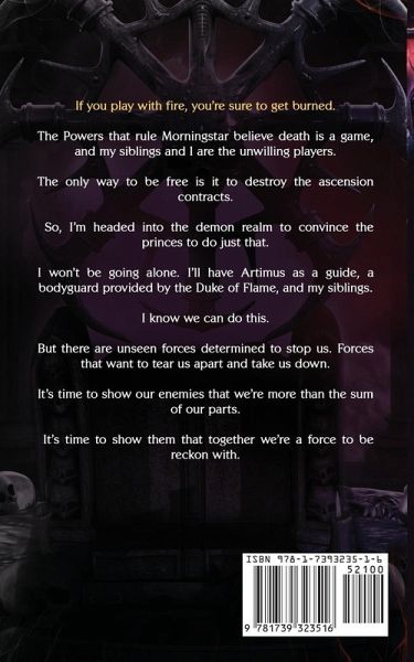 If you play with fire, you're sure to get burned. The Powers that rule Morningstar believe death is a game, and my siblings and I are the unwilling players. The only way to be free is it to destroy the ascension contracts. So, I'm headed into the demon realm to convince the princes to do just that. I won't be going alone. I'll have Artimus as a guide, a bodyguard provided by the Duke of Flame, and my siblings. I know we can do this. But there are unseen forces determined to stop us. Forces that want to tear us apart and take us down. It's time to show our enemies that we're more than the sum of our parts. It's time to show them that together we're a force to be reckoned with.