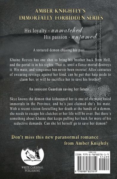 Amber Knightly delivers in this seductive tale of a foreboding demon and a fierce Guardian, two unlikely mates and a passion that's deemed "forbidden". A tortured demon chasing his past... Khaine Reeves has one shot to bring his brother back from Hell, and the portal is in his sights. That is, until a fierce mortal destroys it. His mate, and vengeance has never been sweeter. After centuries of swearing revenge against her kind, can he put that hate aside to claim her, or will he sacrifice her to save his brother? An innocent Guardian saving her future... Skye knows the demon that kidnapped her is one of the most hated immortals in the Province, and he's just claimed she's his mate. With a recent vision foretelling her death at the hands of a demon, she needs to escape his clutches or her life will be over. But there's something about Khaine that keeps pulling her back for more of his seductive demands. Can she let herself go to save her demon?