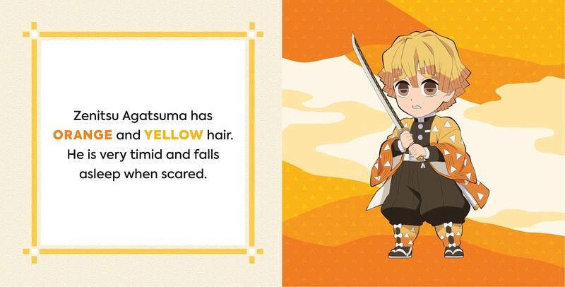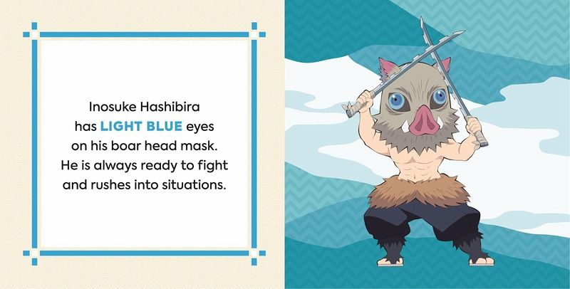 Teach babies and toddlers their basic colors with this officially licensed Demon Slayer: Kimetsu no Yaiba board book for fans young and old! The Demon Slayers Corp members and the Hashira are very colorful. Tanjiro, who is kindhearted, wears a green haori. His sister, Nezuko, wears a pink kimono while she protects humans. Timid Zenitsu has orange and yellow hair, while Inosuke's light blue eyes shine through his wild board mask. Fans of the hit anime show Demon Slayer: Kimetsu no Yaiba will enjoy sharing their love of anime with little ones while teaching them basic colors and important character traits with their favorite members of the Demon Slayer Corps.