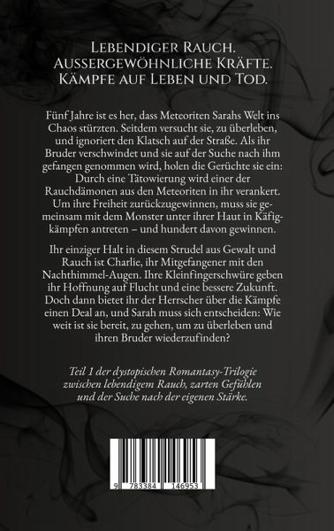 Lebendiger Rauch.Außergewöhnliche Kräfte.Kämpfe auf Leben und Tod.Fünf Jahre ist es her, dass Meteoriten Sarahs Welt ins Chaos stürzten. Seitdem versucht sie, zu überleben, und ignoriert den Klatsch auf der Straße. Als ihr Bruder verschwindet und sie auf der Suche nach ihm gefangen genommen wird, holen die Gerüchte sie ein: Durch eine Tätowierung wird einer der Rauchdämonen aus den Meteoriten in ihr verankert. Um ihre Freiheit zurückzugewinnen, muss sie gemeinsam mit dem Monster unter ihrer Haut in Käfigkämpfen antreten - und hundert davon gewinnen.Ihr einziger Halt in diesem Strudel aus Gewalt und Rauch ist Charlie, ihr Mitgefangener mit den Nachthimmel-Augen. Ihre Kleinfingerschwüre geben ihr Hoffnung auf Flucht und eine bessere Zukunft. Doch dann bietet ihr der Herrscher über die Kämpfe einen Deal an, und Sarah muss sich entscheiden: Wie weit ist sie bereit, zu gehen, um zu überleben und ihren Bruder wiederzufinden?Teil 1 der dystopischen Romantasy-Trilogie zwischen lebendigemRauch, zarten Gefühlen und der Suche nach der eigenen Stärke.