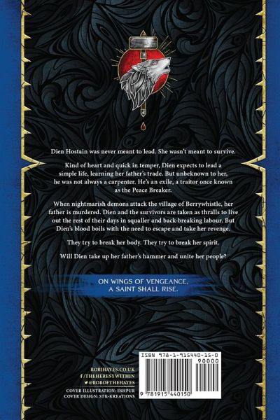 Dien Hostain was never meant to lead. She wasn't meant to survive. Kind of heart and quick in temper, Dien expects to lead a simple life, learning her father's trade. But unbeknown to her, he was not always a carpenter. He's an exile, a traitor once known as the Peace Breaker. When nightmarish demons attack the village of Berrywhistle, her father is murdered. Dien and the survivors are taken as thralls to live out the rest of their days in squaller and back-breaking labour. But Dien's blood boils with the need to escape and take her revenge. They try to break her body. They try to break her spirit. Will Dien take up her father's hammer and unite her people? On wings of vengeance, a Saint shall rise. A new epic fantasy saga full of angels, demons, heroes, and mystery, from award-winning author Rob J. Hayes. Perfect for fans of Brandon Sanderson, John Gwynne, and Ryan Cahill.