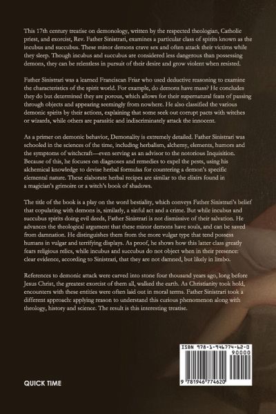 This 17th century treatise on demonology, written by the respected theologian, Catholic priest, and exorcist, Rev. Father Sinistrari, examines a particular class of spirits known as the incubus and succubus. These minor demons crave sex and often attack their victims while they sleep. Though incubus and succubus are considered less dangerous than possessing demons, they can be relentless in pursuit of their desire and grow violent when resisted. Demoniality advances novel theories about occult biology, claiming demons can reanimate corpses to have sex and impregnate victims with demonic seed to produce offspring who are "tall, hardy, bold and wicked." An expert on witchcraft and sexual sin, Rev. Father Sinistrari included sections on related phenomena, including: bestiality, necrophilia, demonic pacts, witchcraft, witches' marks, devil worship and magical beings such as fauns, centaurs and elves. Father Sinistrari was a learned Franciscan Friar who used deductive reasoning to examine the characteristics of the spirit world. For example, do demons have mass? He concludes they do, but determines they are porous-allowing for their supernatural feats of passing through objects and appearing from nowhere. He also classified the demonic spirits by their actions, explaining that some seek out corrupt pacts with witches or wizards, while others are parasitic and indiscriminately attack the innocent. As a primer on demonic behavior, Demonality is extremely detailed. Father Sinistrari was schooled in the sciences of the time, including herbalism, alchemy, elements, humors and the symptoms of witchcraft-even serving as an advisor to the notorious Inquisition. Because of this, he focuses on diagnoses and remedies to expel the pests, using his alchemical knowledge to devise herbal formulas for countering a demon's specific elemental nature. These elaborate herbal recipes are similar to the elixirs found in a magician's grimoire or a witch's book of shadows. The title of the book is a play on the word bestiality, which conveys Father Sinistrari's belief that copulating with demons is, similarly, a sinful act and a crime. But while incubus and succubus are spirits doing evil deeds, Father Sinistrari is not dismissive of their salvation. He advances the theological argument that these minor demons have souls, and can be saved from damnation. He distinguishes them from the more vulgar type that tend to possess humans in terrifying displays. As proof, he shows how this latter class of demon greatly fears religious relics, while incubus and succubus do not object when in their presence: clear evidence, according to Sinistrari, that they are not damned, but are likely in limbo. As a prominent exorcist of his time, Father Sinistrari encountered victims of demonic activity on a regular basis. Many of the afflicted were, ironically, nuns and priests in the service of God or people under their care. In one story, a young maiden of noble birth is romantically pursued by a spirit that, out of frustration with her chastity, finally attacks her. Another story involves a nun who disappeared to her cell where two voices are heard along with groaning and the creaking of her bed. A rival nun drilled a hole through the partition to see an attractive young man lying with her sister who mysteriously disappeared when the two were confronted. References to demonic attack were carved into stone four thousand years ago long before Jesus Christ, the greatest exorcist of them all, walked the earth. As Christianity took hold, encounters with these entities were often laid out in moral terms. Father Sinistrari took a different approach: applying reason to understand this curious phenomenon along with theology, history and science. The result is this interesting treatise.