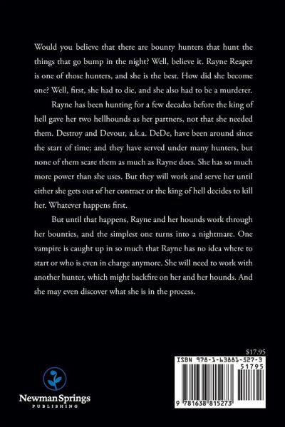 Would you believe that there are bounty hunters that hunt the things that go bump in the night? Well, believe it. Rayne Reaper is one of those hunters, and she is the best. How did she become one? Well, first, she had to die, and she also had to be a murderer. Rayne has been hunting for a few decades before the king of hell gave her two hellhounds as her partners, not that she needed them. Destroy and Devour, a.k.a. DeDe, have been around since the start of time; and they have served under many hunters, but none of them scare them as much as Rayne does. She has so much more power than she uses. But they will work and serve her until either she gets out of her contract or the king of hell decides to kill her. Whatever happens first. But until that happens, Rayne and her hounds work through her bounties, and the simplest one turns into a nightmare. One vampire is caught up in so much that Rayne has no idea where to start or who is even in charge anymore. She will need to work with another hunter, which might backfire on her and her hounds. And she may even discover what she is in the process.