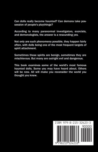 Can dolls really become haunted? Can demons take possession of people's playthings? According to a large number of paranormal investigators, exorcists, and demonologists, the answer is a resounding yes. Not only are such phenomena possible, they happen fairly often, with dolls being one of the most frequent targets of spirit attachment. Sometimes those spirits are benign, or at the most mischievous. But many are outright evil and dangerous. This book examines some of the world's most famous haunted dolls. Some you may have heard about. Others will be new. All will make you reconsider the world you thought you knew. Here is some of what you'll find inside:Robert, the haunted doll from Key West. A lot of the information out there about him is wrong. Find out the truth behind the legend. But don't think the truth is any less terrifying. Annabelle, the demonic doll featured in the movies The Conjuring and Annabelle. Find out why the real Annabelle is much, much more frightening. Peggy, the Internet sensation. Why you should think twice before looking at her picture. Find out which doll started as a hoax, turned into a terrifying reality, and is now considered one of the most "active" haunted dolls in the world. Discover which exotic locale and tourist attraction is a pediophobe's biggest nightmare. You won't believe such a place exists. Clown dolls. Need more be said? These stories and many more are what you'll find in this collection of true accounts from the frightening yet fascinating world of haunted and demonic dolls. Reading this book will undoubtedly raise more questions than it answers, but one thing is assured: you'll never look at a doll the same again.