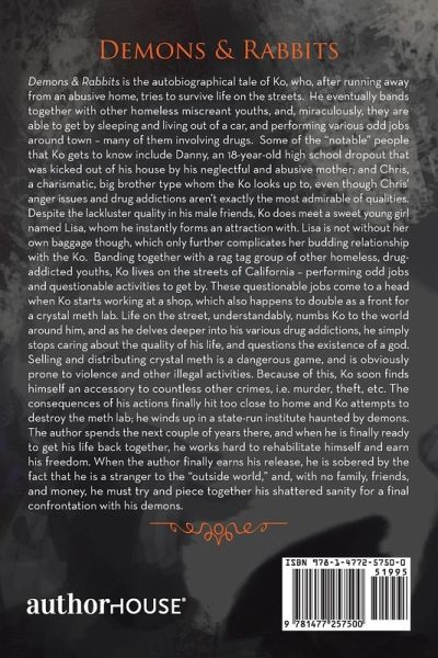 Demons & Rabbits is the autobiographical tale of Ko, who, after running away from an abusive home, tries to survive life on the streets. He eventually bands together with other homeless miscreant youths, and, miraculously, they are able to get by sleeping and living out of a car, and performing various odd jobs around town - many of them involving drugs. Some of the "notable" people that Ko gets to know include Danny, an 18-year-old high school dropout that was kicked out of his house by his neglectful and abusive mother; and Chris, a charismatic, big brother type whom the Ko looks up to, even though Chris' anger issues and drug addictions aren't exactly the most admirable of qualities. Despite the lackluster quality in his male friends, Ko does meet a sweet young girl named Lisa, whom he instantly forms an attraction with. Lisa is not without her own baggage though, which only further complicates her budding relationship with the Ko. Banding together with a rag tag group of other homeless, drugaddicted youths, Ko lives on the streets of California - performing odd jobs and questionable activities to get by. These questionable jobs come to a head when Ko starts working at a shop, which also happens to double as a front for a crystal meth lab. Life on the street, understandably, numbs Ko to the world around him, and as he delves deeper into his various drug addictions, he simply stops caring about the quality of his life, and questions the existence of a god. Selling and distributing crystal meth is a dangerous game, and is obviously prone to violence and other illegal activities. Because of this, Ko soon finds himself an accessory to countless other crimes, i.e. murder, theft, etc. The consequences of his actions finally hit too close to home and Ko attempts to destroy the meth lab; he winds up in a state-run institute haunted by demons. The author spends the next couple of years there, and when he is finally ready to get his life back together, he works hard to rehabilitate himself and earn his freedom. When the author finally earns his release, he is sobered by the fact that he is a stranger to the "outside world," and, with no family, friends, and money, he must try and piece together his shattered sanity for a final confrontation with his demons.