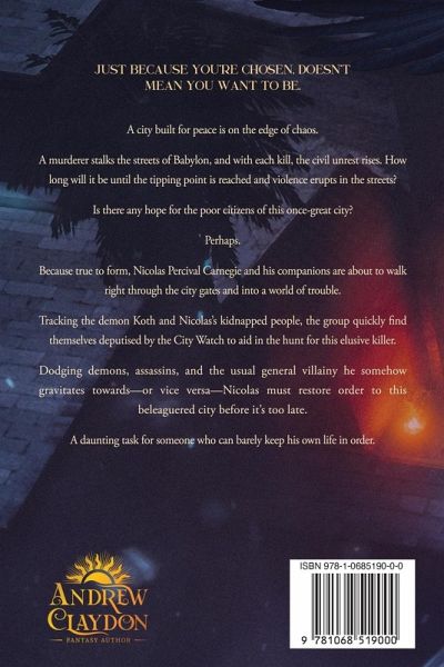 Just because you're chosen, doesn't mean you want to be.A city built for peace is on the edge of chaos.A murderer stalks the streets of Babylon, and with each kill, the civil unrest rises. How long will it be until the tipping point is reached and violence erupts in the streets?Is there any hope for the poor citizens of this once-great city?Perhaps. Because true to form, Nicolas Percival Carnegie and his companions are about to walk right through the city gates and into a world of trouble.Tracking the demon Koth and Nicolas's kidnapped people, the group quickly find themselves deputised by the City Watch to aid in the hunt for this elusive killer.Dodging demons, assassins, and the usual general villainy he somehow gravitates towards-or vice versa-Nicolas must restore order to this beleaguered city before it's too late.A daunting task for someone who can barely keep his own life in order.