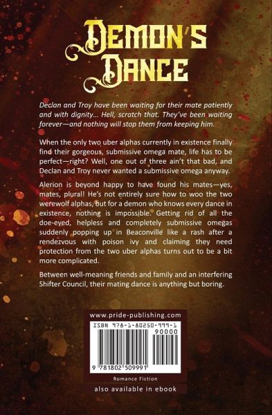 Declan and Troy have been waiting for their mate patiently and with dignity... Hell, scratch that. They've been waiting forever-and nothing will stop them from keeping him. When the only two uber alphas currently in existence finally find their gorgeous, submissive omega mate, life has to be perfect-right? Well, one out of three ain't that bad, and Declan and Troy never wanted a submissive omega anyway. Finding the right mating gift to impress their royal mate turns out to be a bit of a challenge, but the way they see it, that's just an opportunity to show how perfectly suitable they are to be Alerion's mates. If only the damn street tom would stop trying to make minced meat out of their arms. Alerion is beyond happy to have found his mates-yes, mates, plural! He's not entirely sure how to woo the two werewolf alphas, but for a demon who knows every dance in existence, nothing is impossible. Getting rid of all the doe-eyed, helpless and completely submissive omegas suddenly popping up in Beaconville like a rash after a rendezvous with poison ivy and claiming they need protection from the two uber alphas turns out to be a bit more complicated. Between well-meaning friends and family and an interfering Shifter Council, their mating dance is anything but boring.