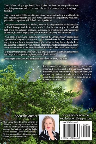 "Dad! When did you get here?" Kevis looked up from his comp-vid-he was completing notes on a patient. He entered the last bit of information and stood to greet his father."Kev, I have a patient I'd like to put in your clinic," Karzac said, walking in to sit beside his son's beautifully polished wood desk. Kevis, a physician for the past thirty years, ran a private clinic for patients with difficult mental problems."Dad, surely not one of the Saa Thalarr," Kevis sat down again and hit an electronic key on his deskcomp. Kevis looked very much like his father-nearly six feet tall with light-brown hair and green-gold eyes. He'd opened his private clinic twenty years earlier on Refizan, his father helping financially. Kevis was doing very well for himself."No. Not one of those. And I think when we get her, the Larentii will have already made a great deal of progress in her treatment. What we really need for her, I think, is peace and quiet, where there isn't anyone troubling her with something that needs to be done. She hasn't had a vacation in years, has been attacked and made very ill recently and there are other circumstances that have affected her. She almost killed herself three days ago.""Is there anything unusual about her?" Kevis lifted an eyebrow at his father. He suspected that the prospective patient might not be completely human."She's High Demon, son, and hasn't been treated well for a very long time." * * *Reah's mental health is compromised, new enemies appear and Teeg's control of the Campiaan Alliance is threatened. While Reah struggles to regain her health, her mates work to redeem themselves and reclaim her trust. Meanwhile, signs begin to appear-are the God Wars imminent? Only time will tell.
