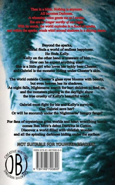 Then in a blink. Nothing is anymore. All becomes Darkness. A wheezing voice greets me as I awake. You are no longer worthy of our Light. With its words, the world explodes in a flood of sparks, and within the sparks, winds whirl around shadows in a shining dance. Beyond the sparks, Gabriel finds a world of endless happiness. He finds Kelly. Kelly on the other hand is unaware of him. How can he expect anything else? She is a little girl who loves her teddy bear Chester, and Gabriel is the monster hiding under Chester's skin. The world outside of Chester's glass eyes blooms with beauty, but even heaven has its shadows. As night falls, Nightmares search for hurt children to feed on and the monsters playing in the daylight show the true cruelty of Kelly's beautiful world. Gabriel must fight for his and Kelly's survival Can Gabriel save her? Or will he succumb under the Nightmares' hungry fangs? For fans of mysterious grim worlds and heart wrenching horror comes Ben Mire's debut Demons in Cotton. Discover a world filled with childish wonder through the eyes of a lost warrior as he follows Kelly through all the spiraling darkness hiding under the surface. NOT SUITABLE FOR YOUNGER READERS