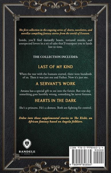 The first collection in the ongoing series of fantasy stories from the world of Esowon. Inside, you'll find dastardly beasts, tortured monks, and unexpected lovers in a set of tales that'll transport you to lands lost to time. The collection includes: Last of My Kind When the war with the humans started, there were hundreds of us. Then it was just me and Father. Now it's just me. A Servant's Work Amana has a special gift to see into the future. But one day something goes horribly wrong, something he never foresaw. Hearts in the Dark She's a princess. He's a demon. They couldn't be any more wrong for each other. But when they find themselves stuck in a cave together they discover an undeniable connection. Delve into these companion novellas to The Kishi, an African fantasy based on Angola folklore.