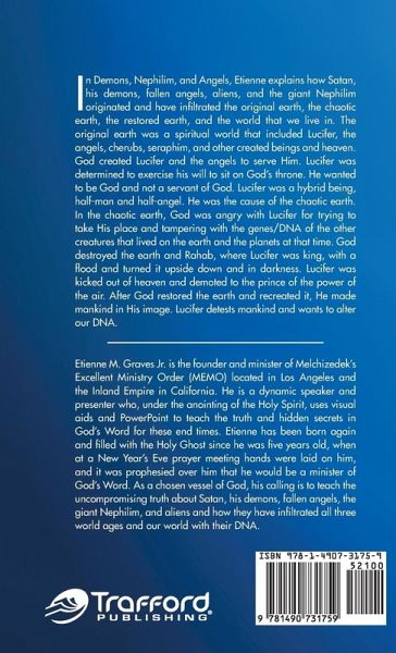 In Demons, Nephilim, and Angels, Etienne explains how Satan, his demons, fallen angels, aliens, and the giant Nephilim originated and have infiltrated the original earth, the chaotic earth, the restored earth, and the world that we live in. The original earth was a spiritual world that included Lucifer, the angels, cherubs, seraphim, and other created beings and heaven. God created Lucifer and the angels to serve Him. Lucifer was determined to exercise his will to sit on God's throne. He wanted to be God and not a servant of God. Lucifer was a hybrid being, half-man and half-angel. He was the cause of the chaotic earth. In the chaotic earth, God was angry with Lucifer for trying to take His place and tampering with the genes/DNA of the other creatures that lived on the earth and the planets at that time. God destroyed the earth and Rahab, where Lucifer was king, with a flood and turned it upside down and in darkness. Lucifer was kicked out of heaven and demoted to the prince of the power of the air. After God restored the earth and recreated it, He made mankind in His image. Lucifer detests mankind and wants to alter our DNA.