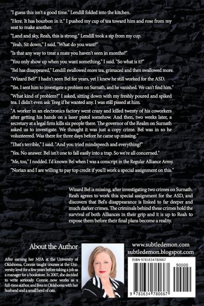 "I guess this isn't a good time." Lendill folded into the kitchen."Here. It has bourbon in it." I pushed my cup of tea toward him and rose from my seat to make another."Land and sky, Reah, this is strong." Lendill took a sip from my cup."Yeah. Sit down," I said. "What do you want?""Is that any way to treat a mate you haven't seen in months?""You only show up when you want something," I said. "So what is it?""Bel has disappeared," Lendill swallowed more tea, grimaced and then swallowed more."Wizard Bel?" I hadn't seen Bel for years, yet I knew he still worked for the ASD."Yes. I sent him to investigate a problem on Surnath, and he vanished. We can't find him.""What kind of problem?" I asked, sitting down with my freshly poured and spiked tea. I didn't even ask Teeg if he wanted any. I was still pissed at him."A worker in an electronics factory went crazy and killed twenty of his coworkers after getting his hands on a laser pistol somehow. And then, two weeks later, a secretary at a legal firm kills six people there. The governor of the Realm on Surnath asked us to investigate. We thought it was just a copy crime. Bel was in so he volunteered. Was there for three days before he came up missing.""That's terrible," I said. "And you tried mindspeech and everything?""Yes. No answer. Bel isn't one to fall easily into a trap. So we're all concerned.""Me, too," I nodded. I'd known Bel when I was a conscript in the Regular Alliance Army."Norian and I are willing to pay top credit if you'll work a special assignment on this."Wizard Bel is missing, after investigating two crimes on Surnath. Reah agrees to work this special assignment for the ASD, and discovers that Bel's disappearance is linked to far deeper and much darker crimes. The criminals behind these crimes hold the survival of both Alliances in their grip and it is up to Reah to expose them before their final plans become a reality.