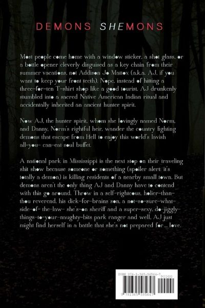 Most people come home with a window sticker, a shot glass, or a bottle opener cleverly disguised as a key chain from their summer vacations, but not AJ. She drunkenly stumbled into a sacred Native American Indian ritual and accidentally inherited an ancient hunter spirit. Now AJ, Norm (the hunter spirit), and Danny, Norm's rightful heir, wander the country fighting demons that escape from Hell to enjoy this world's lavish all-you-can-eat soul buffet. A national park in Mississippi is the next stop on their traveling shit show because someone or something (spoiler alert: it's totally a demon) is killing residents of a nearby small town. But demons aren't the only thing AJ and Danny have to contend with this go around. Throw in a self-righteous, holier-than-thou reverend, his dick-for-brains son, a not-so-sure-what-side-of-the-law-she's-on sheriff and a super-sexy, do-jiggly-things-to-your-naughty-bits park ranger and well, AJ just might find herself in a battle that she's not prepared for ... love.
