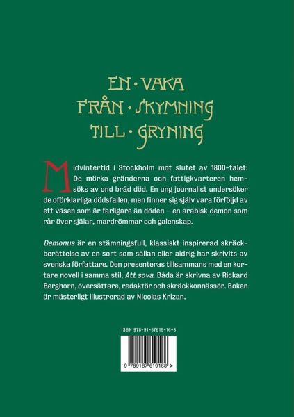 Midvintertid i Stockholm mot slutet av 1800-talet: De mörka gränderna och fattigkvarteren hemsöks av ond bråd död. En ung journalist undersöker de oförklarliga dödsfallen, men finner sig själv vara förföljd av ett väsen som är farligare än döden -- en arabisk demon som rår över själar, mardrömmar och galenskap. Demonus är en stämningsfull, klassiskt inspirerad skräckberättelse av en sort som sällan eller aldrig har skrivits av svenska författare. Den presenteras tillsammans med en kortare novell i samma stil, Att sova. Båda är skrivna av Rickard Berghorn, översättare, redaktör och skräckkonnässör. Boken är mästerligt illustrerad av Nicolas Krizan.