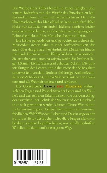 Die Würde eines Volkes besteht in seiner Fähigkeit und seinem Bedürfnis von der Würde des Einzelnen zu lehren und zu lernen -- und sich lehren zu lassen. Denn die Unantastbarkeit des Menschlichen kann und darf dabei nicht nur als Ideal verstanden bleiben, sondern bedarf einer kontinuierlichen, umfassenden und ausgewogenen Lehre, die nicht auf den Menschen begrenzt bleibt.Die bisher gewordenen und gewachsenen Lehren der Menschheit stehen dabei in einer Aufmerksamkeit, die auch über das globale Verständnis des Menschen hinaus reichende Essenzen und vielfältige Wahrheiten vermitteln. Sie ersuchen aber auch zu zeigen, worin die Irrtümer liegen können. Licht, Glanz und Schatten, Schein. Die Entwicklungen der Lehren sind dabei nicht der Beliebigkeit unterworfen, sondern fordern tiefsinnige Aufmerksamkeit und Achtsamkeit, die das Wissen erläutern und erweitern und die Weisheit schätzen und schützen.Der Gedichtband "Demos und Magister" widmet sich den Fragen und Perspektiven der Lehre und der Weisheit und den feineren Erkenntnissen, die aus dem Alltag des Einzelnen, der Politik der Vielen und der Geschichte an sich gewonnen werden können. Denn: Wer träumt nicht von einem guten Leben? Wer träumt nicht von einer friedlichen Welt? Wer dem Leben und Dasein zugewandt ist, so der Tenor des Buches, wird diese Fragen nicht nur bejahen, sondern begriffen haben, was wir alle bedürfen. Wir alle sind damit auf einem guten Weg.