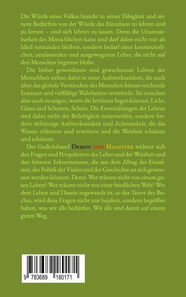 Die Würde eines Volkes besteht in seiner Fähigkeit und seinem Bedürfnis von der Würde des Einzelnen zu lehren und zu lernen -- und sich lehren zu lassen. Denn die Unantastbarkeit des Menschlichen kann und darf dabei nicht nur als Ideal verstanden bleiben, sondern bedarf einer kontinuierlichen, umfassenden und ausgewogenen Lehre, die nicht auf den Menschen begrenzt bleibt.Die bisher gewordenen und gewachsenen Lehren der Menschheit stehen dabei in einer Aufmerksamkeit, die auch über das globale Verständnis des Menschen hinaus reichende Essenzen und vielfältige Wahrheiten vermitteln. Sie ersuchen aber auch zu zeigen, worin die Irrtümer liegen können. Licht, Glanz und Schatten, Schein. Die Entwicklungen der Lehren sind dabei nicht der Beliebigkeit unterworfen, sondern fordern tiefsinnige Aufmerksamkeit und Achtsamkeit, die das Wissen erläutern und erweitern und die Weisheit schätzen und schützen.Der Gedichtband "Demos und Magister" widmet sich den Fragen und Perspektiven der Lehre und der Weisheit und den feineren Erkenntnissen, die aus dem Alltag des Einzelnen, der Politik der Vielen und der Geschichte an sich gewonnen werden können. Denn: Wer träumt nicht von einem guten Leben? Wer träumt nicht von einer friedlichen Welt? Wer dem Leben und Dasein zugewandt ist, so der Tenor des Buches, wird diese Fragen nicht nur bejahen, sondern begriffen haben, was wir alle bedürfen. Wir alle sind damit auf einem guten Weg.