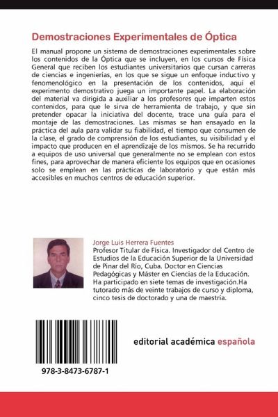 El manual propone un sistema de demostraciones experimentales sobre los contenidos de la Óptica que se incluyen, en los cursos de Física General que reciben los estudiantes universitarios que cursan carreras de ciencias e ingenierías, en los que se sigue un enfoque inductivo y fenomenológico en la presentación de los contenidos, aquí el experimento demostrativo juega un importante papel. La elaboración del material va dirigida a auxiliar a los profesores que imparten estos contenidos, para que le sirva de herramienta de trabajo, y que sin pretender opacar la iniciativa del docente, trace una guía para el montaje de las demostraciones. Las mismas se han ensayado en la práctica del aula para validar su fiabilidad, el tiempo que consumen de la clase, el grado de comprensión de los estudiantes, su visibilidad y el impacto que producen en el aprendizaje de los mismos. Se ha recurrido a equipos de uso universal que generalmente no se emplean con estos fines, para aprovechar de manera eficiente los equipos que en ocasiones solo se emplean en las prácticas de laboratorio y que están más accesibles en muchos centros de educación superior.