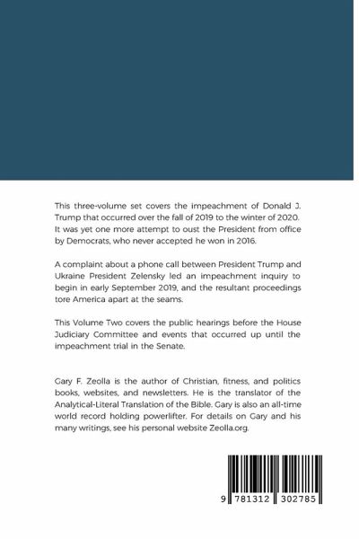 This three-volume set covers the impeachment of Donald J. Trump that occurred over the fall of 2019 to the winter of 2020. It was yet one more attempt to oust the President from office by Democrats, who never accepted he won in 2016. It began when Trump made a phone call on July 25, 2019, the day after Robert Mueller testified before Congress. A complaint about that phone call led an impeachment inquiry to begin in early September, and the resultant proceedings tore America apart at the seams. All of these events were occurring against the backdrop of the 2020 Presidential election, which was already well underway, even though the election itself was still over a year away. As will be seen, and as the title of this three-volume set implies, that election was in fact the real impetus for the impeachment. This trilogy will enable the reader to go back and get caught up on all that you missed. Though this whole fiasco will be over when this trilogy is published, it will be good for Americans to have a history of what happened, as that could affect how they vote in November 2020. We also will sadly see many similar situations in the future. In fact, that was a talking point of Republicans throughout the impeachment proceedings, that Democrats are so watering down impeachment that it will be used as a political weapon anytime in the future when the President is of one party and the House is controlled by the other party. As such, it is important to remember what happened during this impeachment when the next one occurs. In addition, this trilogy will help the reader understand the rancor seen in Washington in general and the dishonest bias of the mainstream media. It will also be seen that the two sides can look at the same evidence and come to two completely different conclusions. These three volumes also answer a question the author has often been asked-how can the author, as a conservative Christian, support such a "crude" person as President Trump? This Volume Two covers the public hearings before the House Judiciary Committee and events that occurred up until the impeachment trial in the Senate.