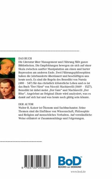 Literatur über Managemend und Führung füllt Bibliotheken. Empfehlungen bewegen sich zwischen sanfter Manipulation auf der einen Seite und harter Repression and der anderen. Zwei Führungskonzepte haben die Jahrhunderte überdauert und beeinflussen das Führungsverständnis heute noch. Es sind die Regeln des Mönches Benedikt von Nursia (480-547) für das klösterliche Leben und es ist das Buch "Der Fürst" vom Machtpolitiker Niccolo Machiavelli (1469-1527). Angelehnt an Original-Zitate wird analysiert, wie sich die unterscheiden und was davon heute noch gültig sein könnte.