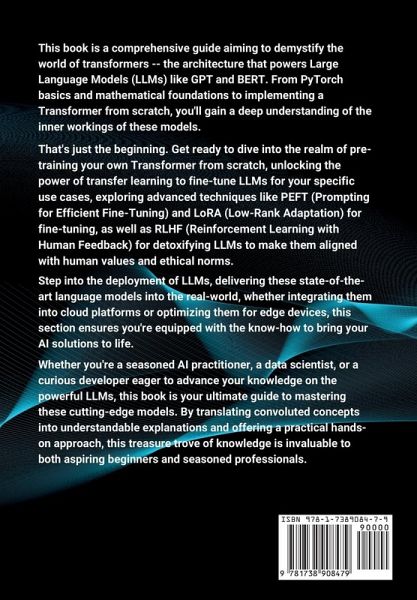 This book is a comprehensive guide aiming to demystify the world of transformers -- the architecture that powers Large Language Models (LLMs) like GPT and BERT. From PyTorch basics and mathematical foundations to implementing a Transformer from scratch, you'll gain a deep understanding of the inner workings of these models. That's just the beginning. Get ready to dive into the realm of pre-training your own Transformer from scratch, unlocking the power of transfer learning to fine-tune LLMs for your specific use cases, exploring advanced techniques like PEFT (Prompting for Efficient Fine-Tuning) and LoRA (Low-Rank Adaptation) for fine-tuning, as well as RLHF (Reinforcement Learning with Human Feedback) for detoxifying LLMs to make them aligned with human values and ethical norms. Step into the deployment of LLMs, delivering these state-of-the-art language models into the real-world, whether integrating them into cloud platforms or optimizing them for edge devices, this section ensures you're equipped with the know-how to bring your AI solutions to life. Whether you're a seasoned AI practitioner, a data scientist, or a curious developer eager to advance your knowledge on the powerful LLMs, this book is your ultimate guide to mastering these cutting-edge models. By translating convoluted concepts into understandable explanations and offering a practical hands-on approach, this treasure trove of knowledge is invaluable to both aspiring beginners and seasoned professionals.
