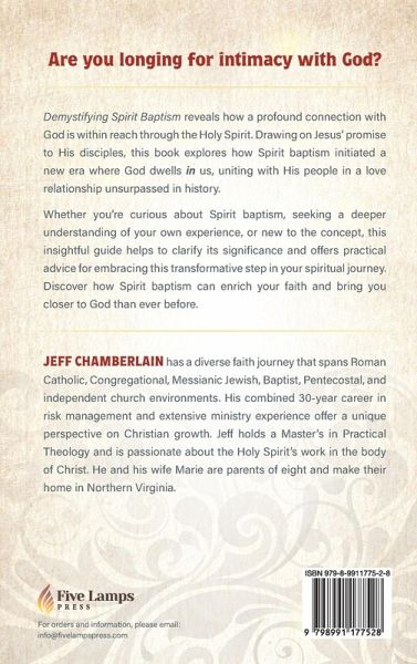 Demystifying Spirit Baptism by Jeff Chamberlain offers a fresh, insightful examination of the pivotal experience of Spirit baptism in the Christian life. Chamberlain, with a background in risk management and a Master's in Practical Theology, raises crucial questions about the risks and rewards of our beliefs about God and Spirit baptism. He invites readers to examine whether common interpretations of scripture might miss God's intended purpose, particularly in light of God's desire for intimacy with his people. This book stands out for its straightforward exploration of Spirit baptism. It blends scriptural foundations and experiential understanding with practical guidance for personal and communal spiritual practice. Chamberlain's analogies and insights clarify the centrality of Spirit baptism, offering readers a deeper understanding of its transformative power in the Christian life. Demystifying Spirit Baptism is written to be accessible to any reader, those seeking to deepen their understanding and those desiring to experience Spirit baptism. It is a must-read for the layperson, pastor, and scholar alike.