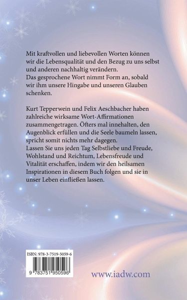 Mit kraftvollen und liebevollen Worten können wir die Lebensqualität und den Bezug zu uns selbst und anderen nachhaltig verändern. Das gesprochene Wort nimmt Form an, sobald wir ihm unsere Hingabe und unseren Glauben schenken.Kurt Tepperwein und Felix Aeschbacher haben zahlreiche wirksame Wort-Affirmationen zusammengetragen. Öfters mal innehalten, den Augenblick erfüllen und die Seele baumeln lassen, spricht somit nichts mehr dagegen. Lassen Sie uns jeden Tag Selbstliebe und Freude, Wohlstand und Reichtum, Lebensfreude und Vitalität erschaffen, indem wir den heilsamen Inspirationen in diesem Buch folgen und sie in unser Leben einfliessen lassen.