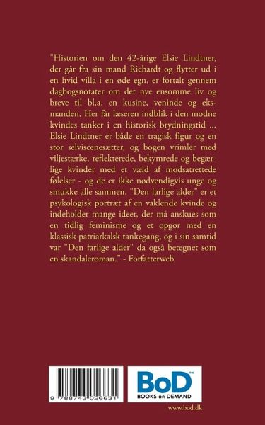 "Historien om den 42-årige Elsie Lindtner, der går fra sin mand Richardt og flytter ud i en hvid villa i en øde egn, er fortalt gennem dagbogsnotater om det nye ensomme liv og breve til bl.a. en kusine, veninde og eksmanden. Her får læseren indblik i den modne kvindes tanker i en historisk brydningstid ... Elsie Lindtner er både en tragisk figur og en stor selviscenesætter, og bogen vrimler med viljestærke, reflekterede, bekymrede og begærlige kvinder med et væld af modsatrettede følelser - og de er ikke nødvendigvis unge og smukke alle sammen. "Den farlige alder" er et psykologisk portræt af en vaklende kvinde og indeholder mange ideer, der må anskues som en tidlig feminisme og et opgør med en klassisk patriarkalsk tankegang, og i sin samtid var "Den farlige alder" da også betegnet som en skandaleroman. - Forfatterweb